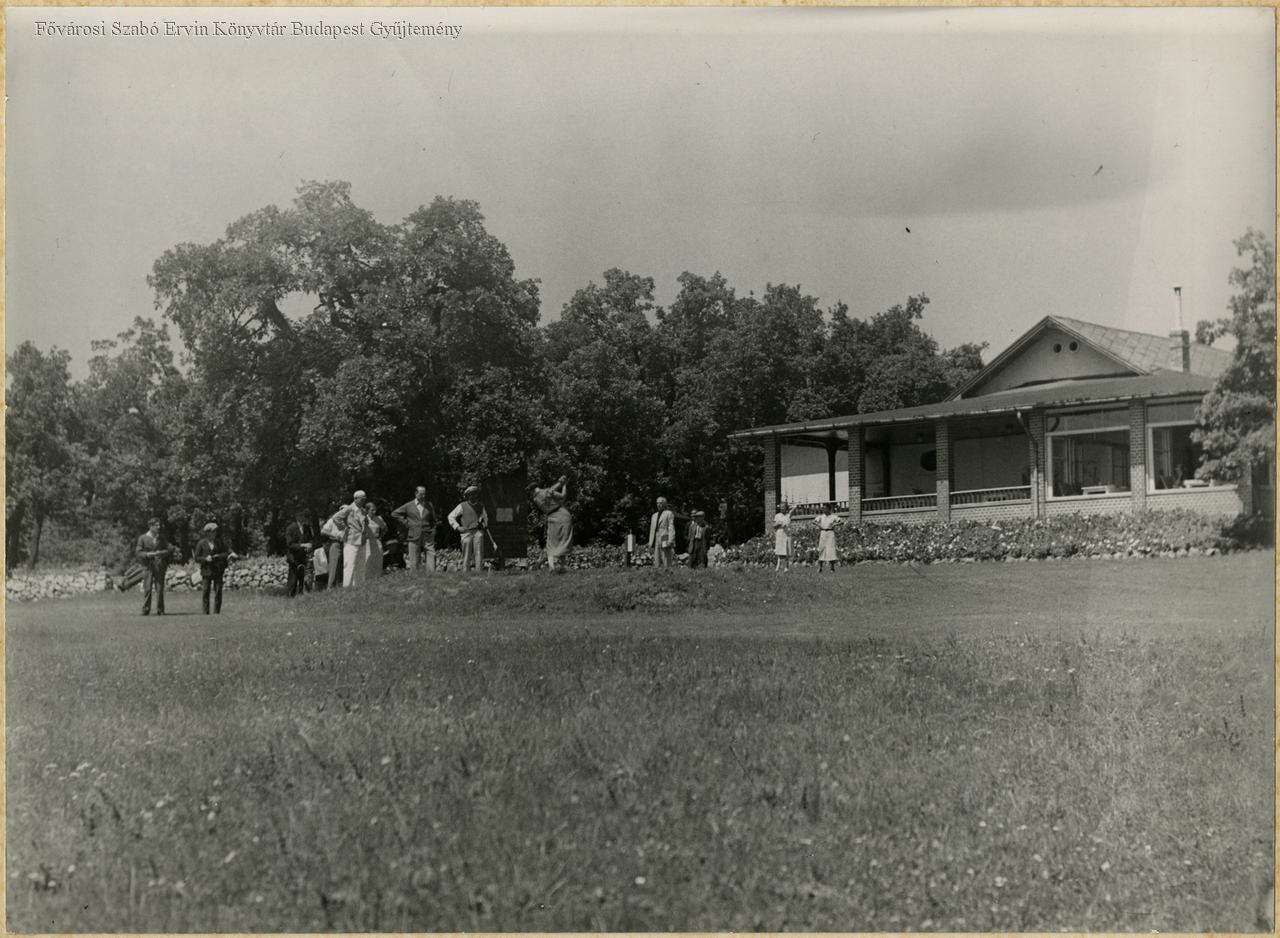 [Golfozók a svábhegyi pályán, háttérben egy földszintes épület]