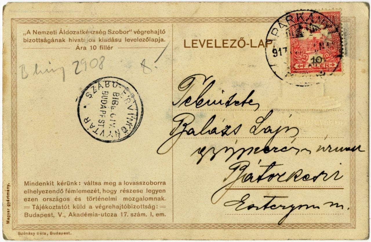 A hátoldalon felhívás a lovasszobron elhelyezendő fémlemez megváltására