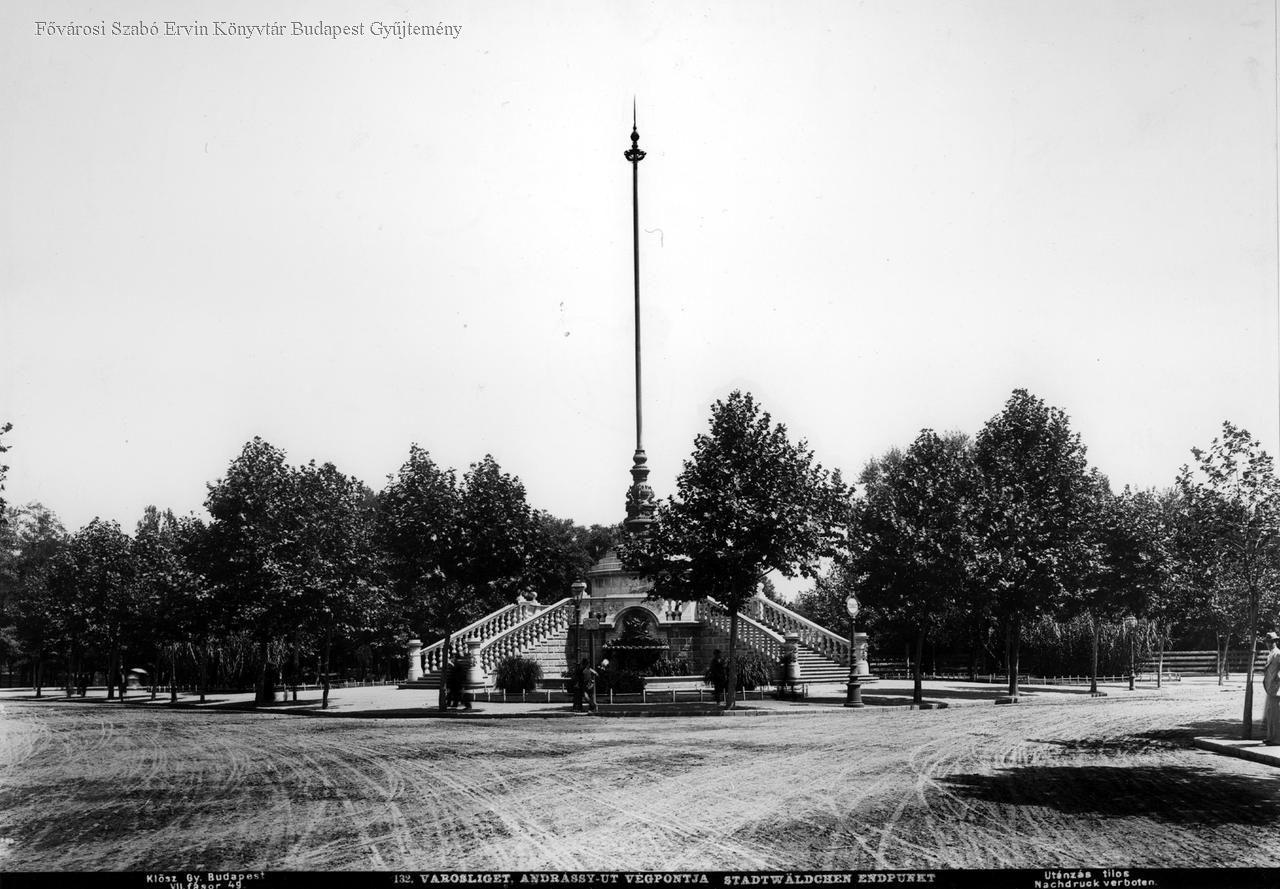 A Sugárút lezárására építette Ybl Miklós 1884-ben a Zsigmondy Vilmos feltárta artézi kút felett emelkedő, zászlórúddal lezárt építményt. Az ezredévi emlékmű építésekor a Széchenyi-hegyre helyezték át. (Vadas Ferenc)