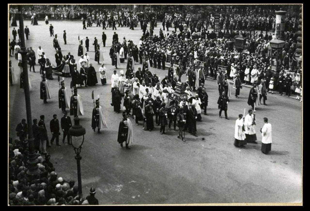 körmenet, főpap, katolikus pap, nézők, történeti évforduló, Szent Imre-év, katolikus egyház, egyházi ünnep, ereklye, testőrség, Horthy-korszak, 1930