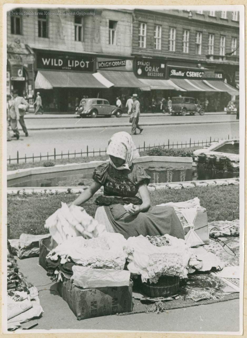 [Matyó kézimunkát áruló utcai árus a Rákóczi úton]
