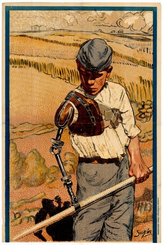 Az 1917-es pozsonyi Országos Hadigondozó Kiállítás hiányos plakátja. A plakáton egy műkarral ellátott hadirokkant látható, amint a szántóföldön dolgozik.