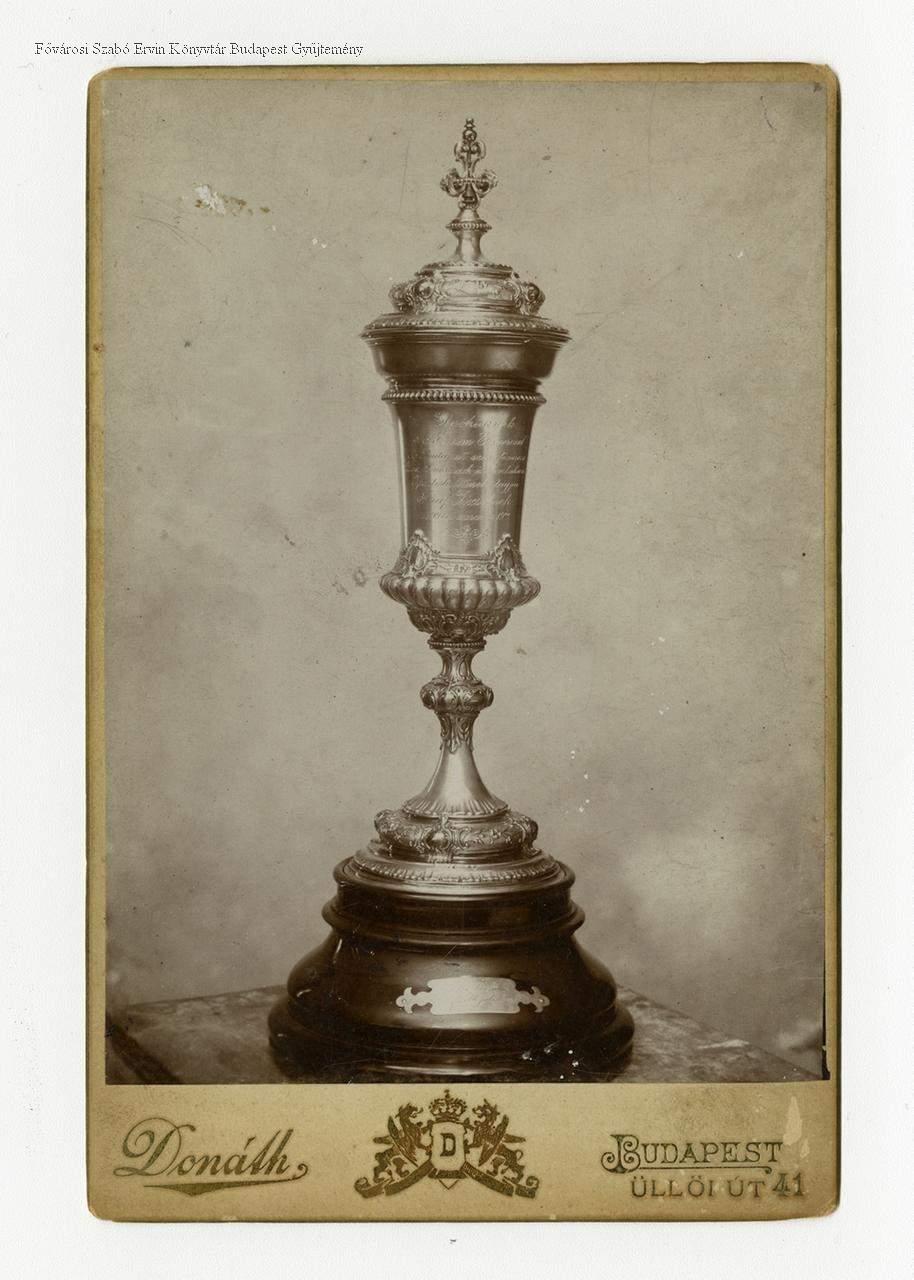 "A díszserleg Elnökünknek / Az Érdem Elismeréséért! / A Budapest Székesfővárosi Sütők, Czukrászok és Mézeskalácsosok Ipartelütének tagjai Graf Józsefnek 1899. évi március 19én."