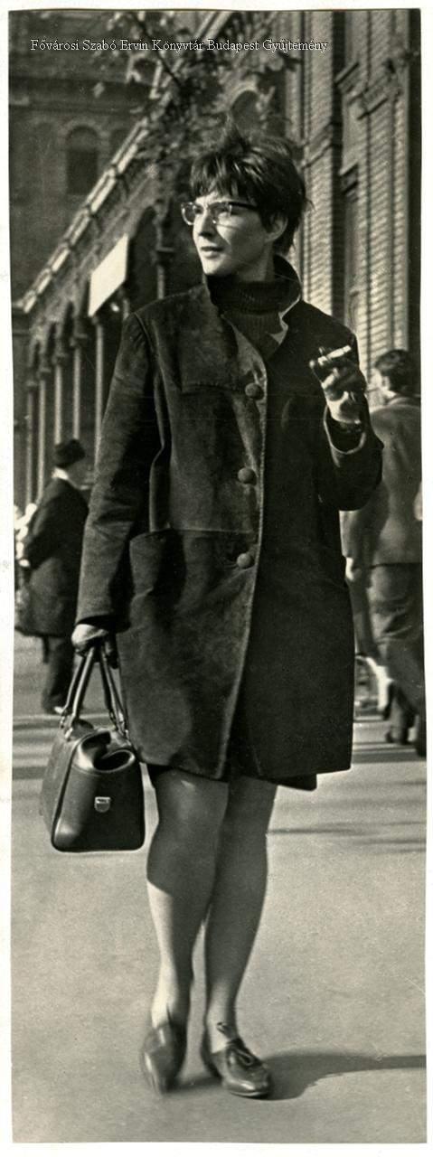 nő, cigaretta, dohányzás, táska, kabát, öltözködés, külső felvétel, jelenetkép, 1960-as évek