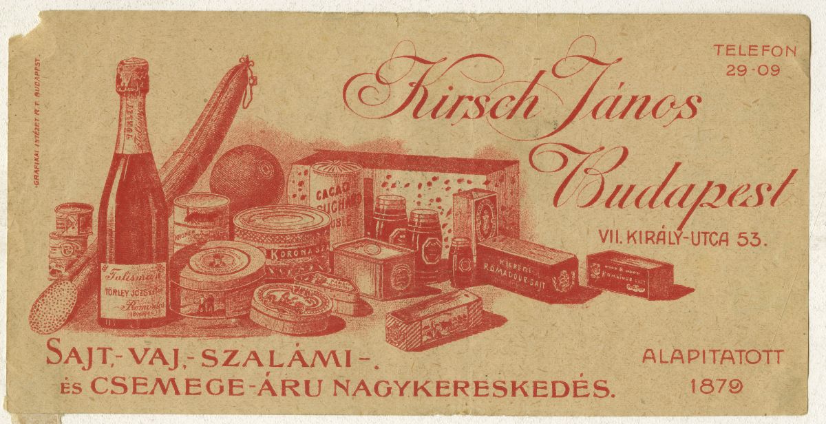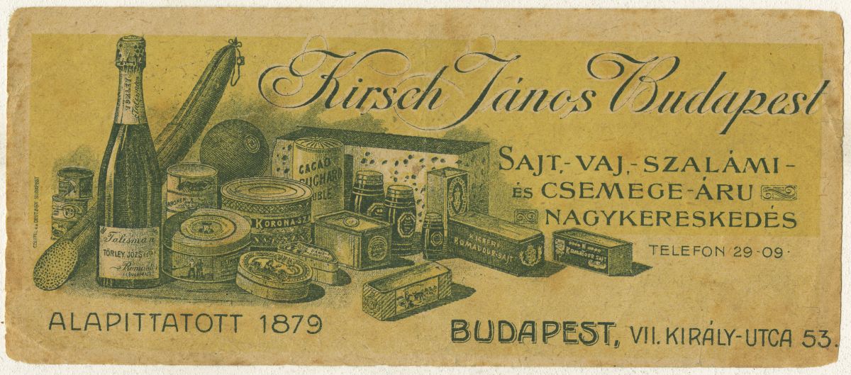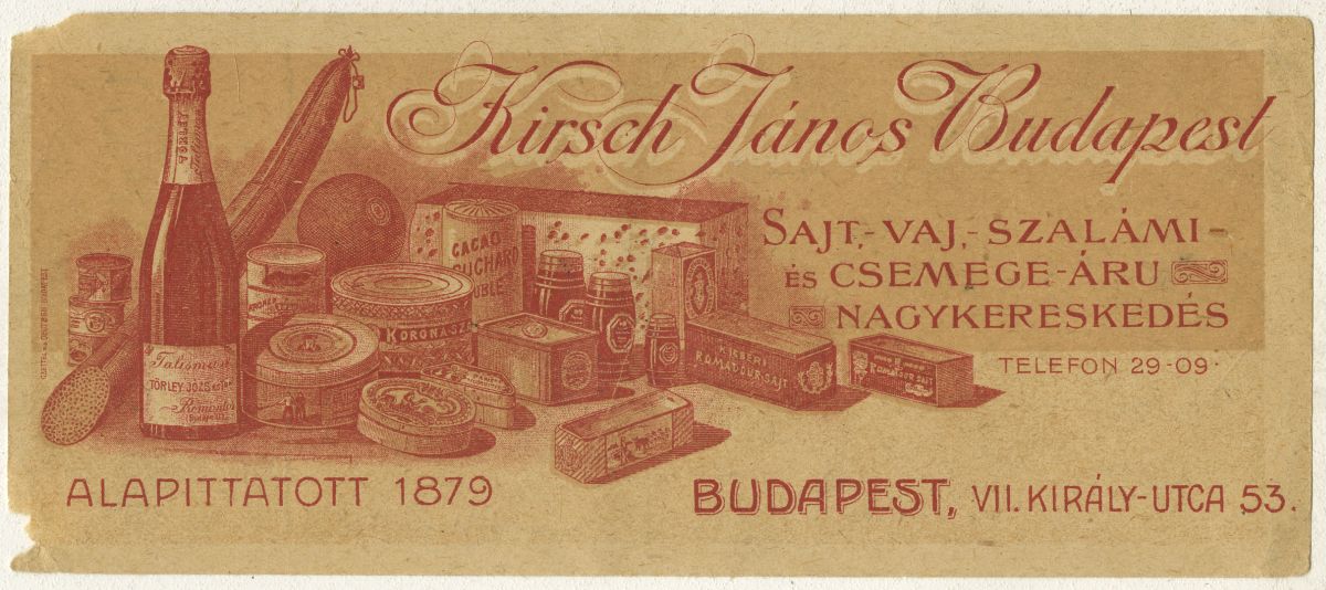 Kirsch János Budapest. Sajt,- vaj-szalámi ls csemege áru nagykereskedés. Telefon 29-09