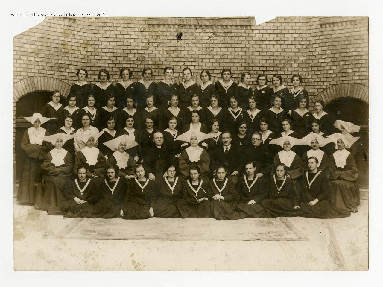 egyházi iskola, római katolikus egyház, vincés irgalmas nővérek, középfokú oktatás, nőképzés, szakképzés, apáca (szerzetes), egyenruha, egyházi ruházat, nő, férfi, lány, csoportkép, 1930-as évek