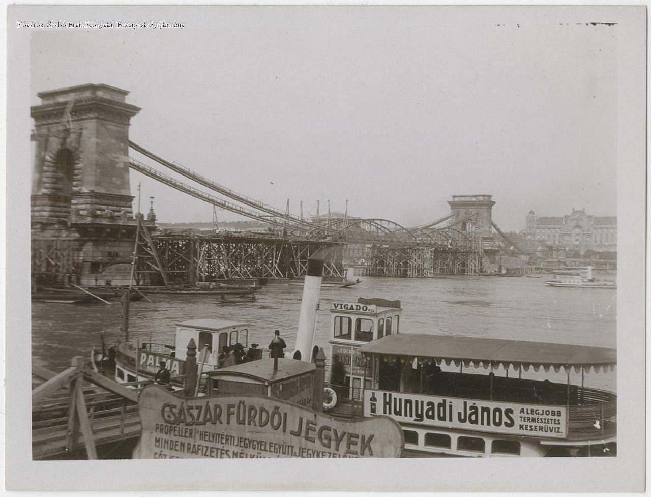 A Lánchíd átépítése, vasszerkezetének megerősítése. Teljes rekonstrukció: 1914. február 3-tól 1915. november 26-ig.