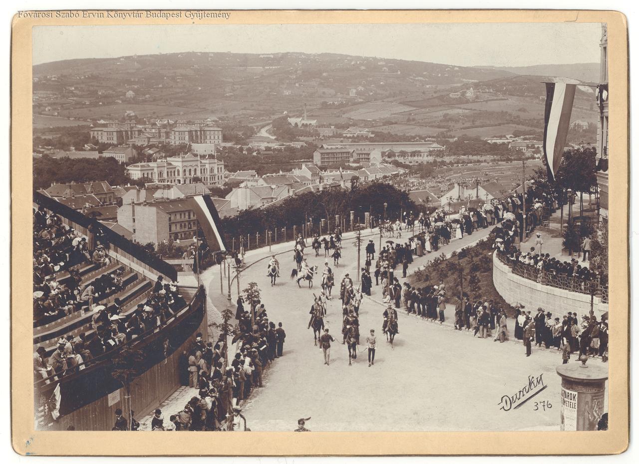 külső felvétel, néptömeg, felvonulás, ló, díszmagyar, zászló, ezredévi kiállítás, ünnepség, koronázás, évforduló, 1896