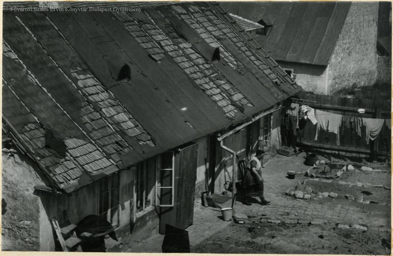 udvar, lakóépület, tető, nő, házimunka, életkép, 1930