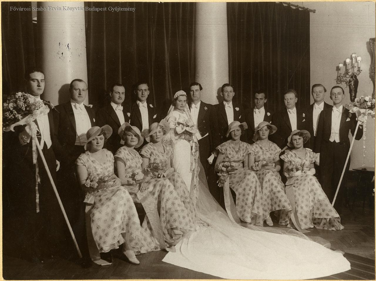 esküvő, ünneplőruha, esküvői fénykép, csoportkép, belső felvétel, 1920-as évek