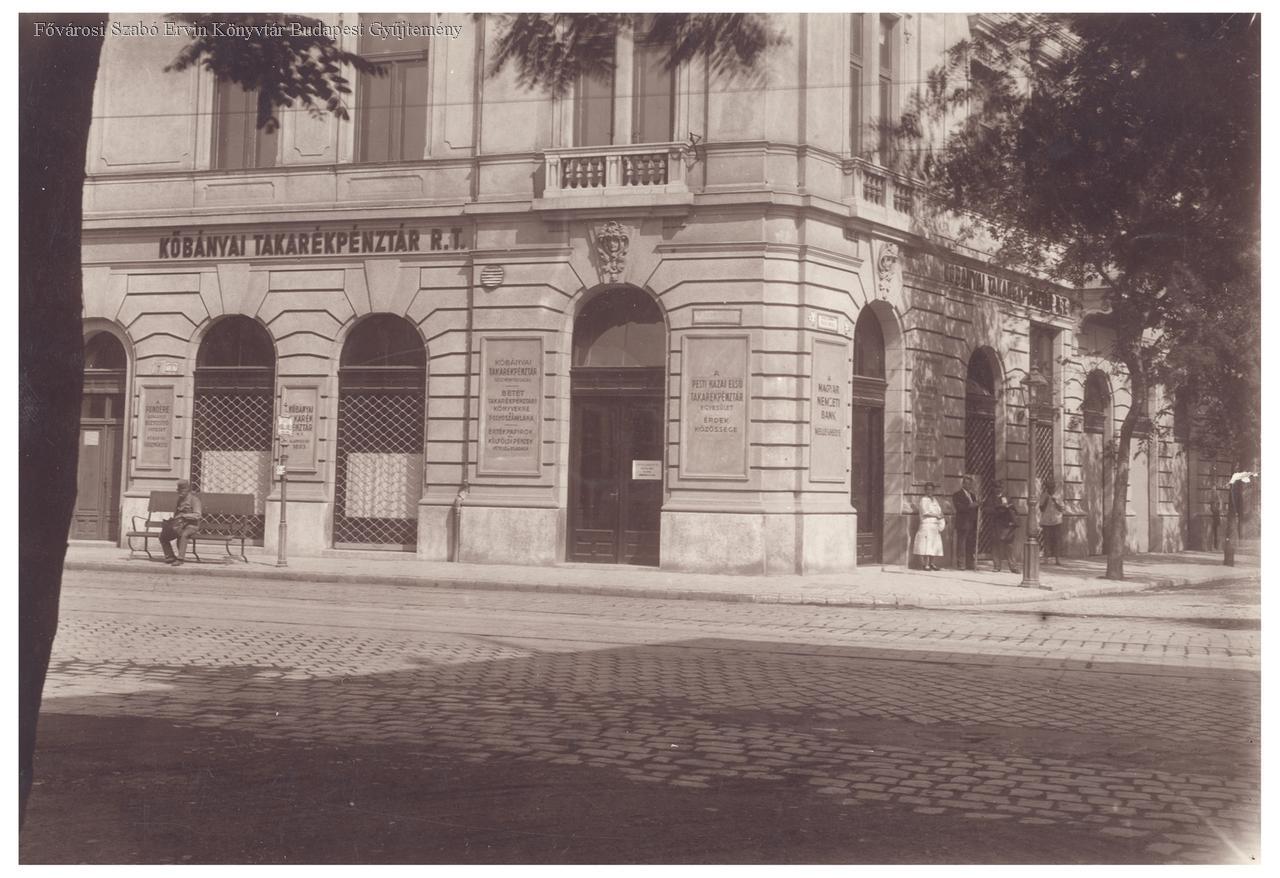 utcakép, takarékpénztár, lakóépület, villamosmegálló