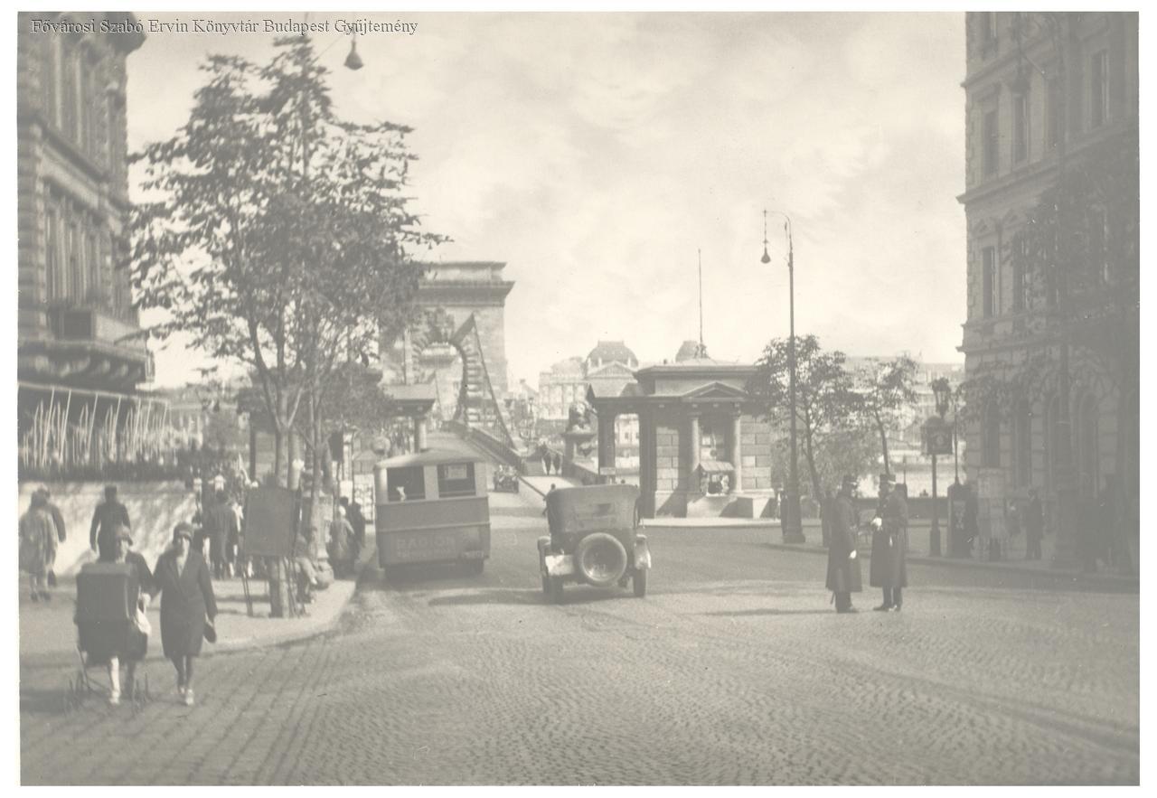 híd, hídvámkezelő épület, ember, autóbuszközlekedés, buszmegálló, gépjármű, rendőr, , babakocsi, utcakép, 1928