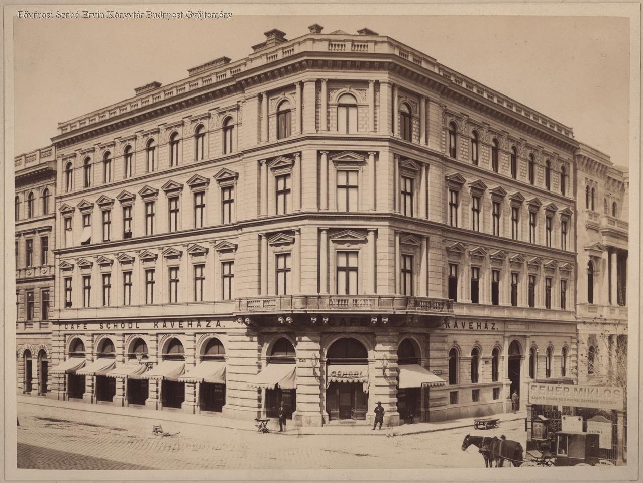kávéház, bérház, cégtábla, fogat, postaláda, kerítés, hirdetőoszlop, épületkép, külső felvétel, 1878 körül