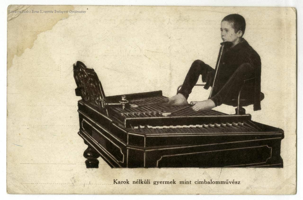 gyermek, testi fogyatékos, zenész, cimbalom, gyermekvédelmi intézmény, képes levelezőlap, belső felvétel, 1900-as évek