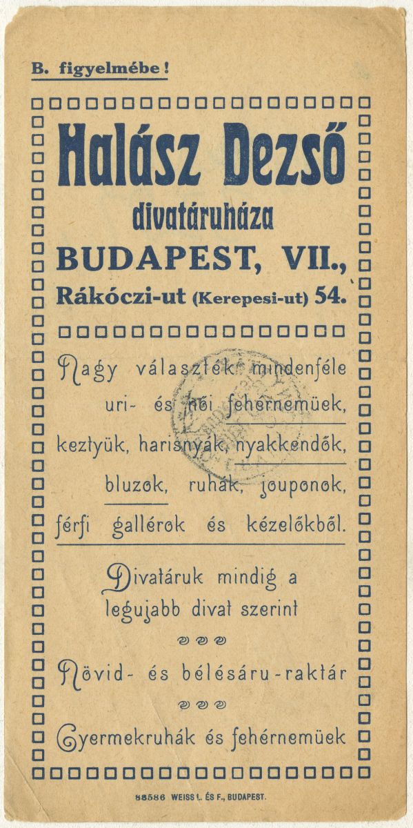 alsóruházat, fehérnemű, divat, divatáru, méteráru, reklámnyomtatvány, kisnyomtatvány, aprónyomtatvány, számolócédula