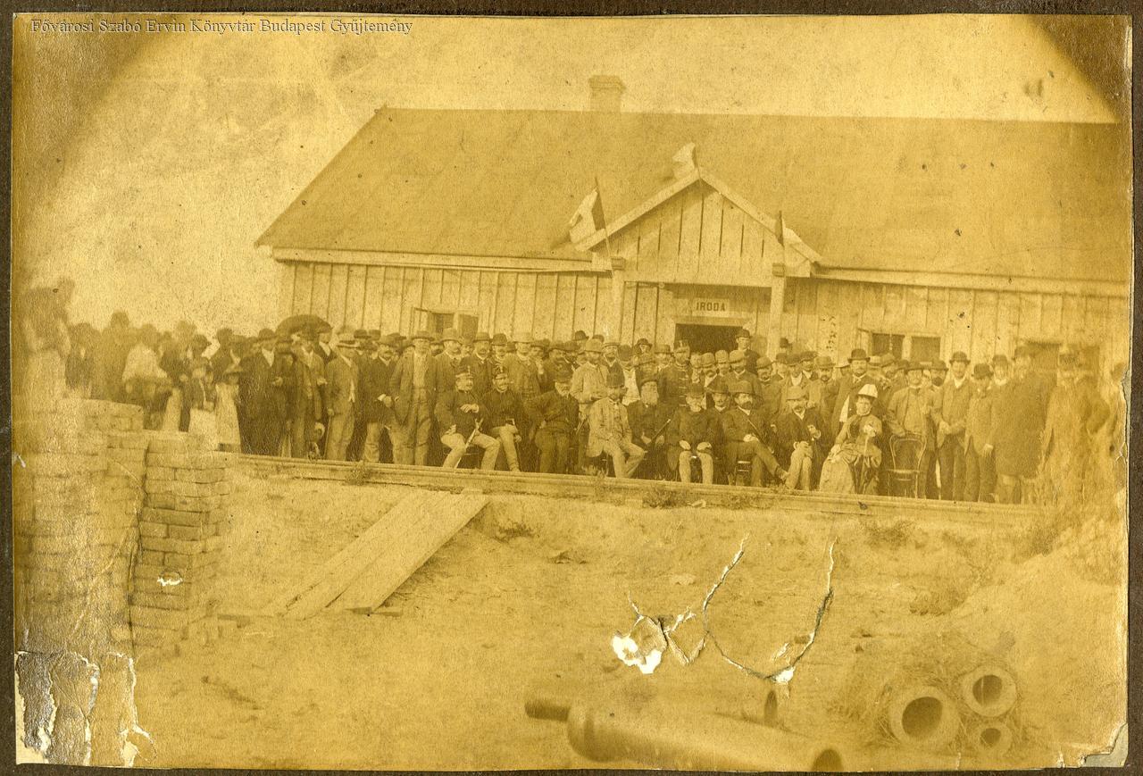 külső felvétel, csoportkép, ünnepség, alapkőletétel, tömegközlekedés, elővárosi vasút, építkezés, sín, ideiglenes épület, faanyag