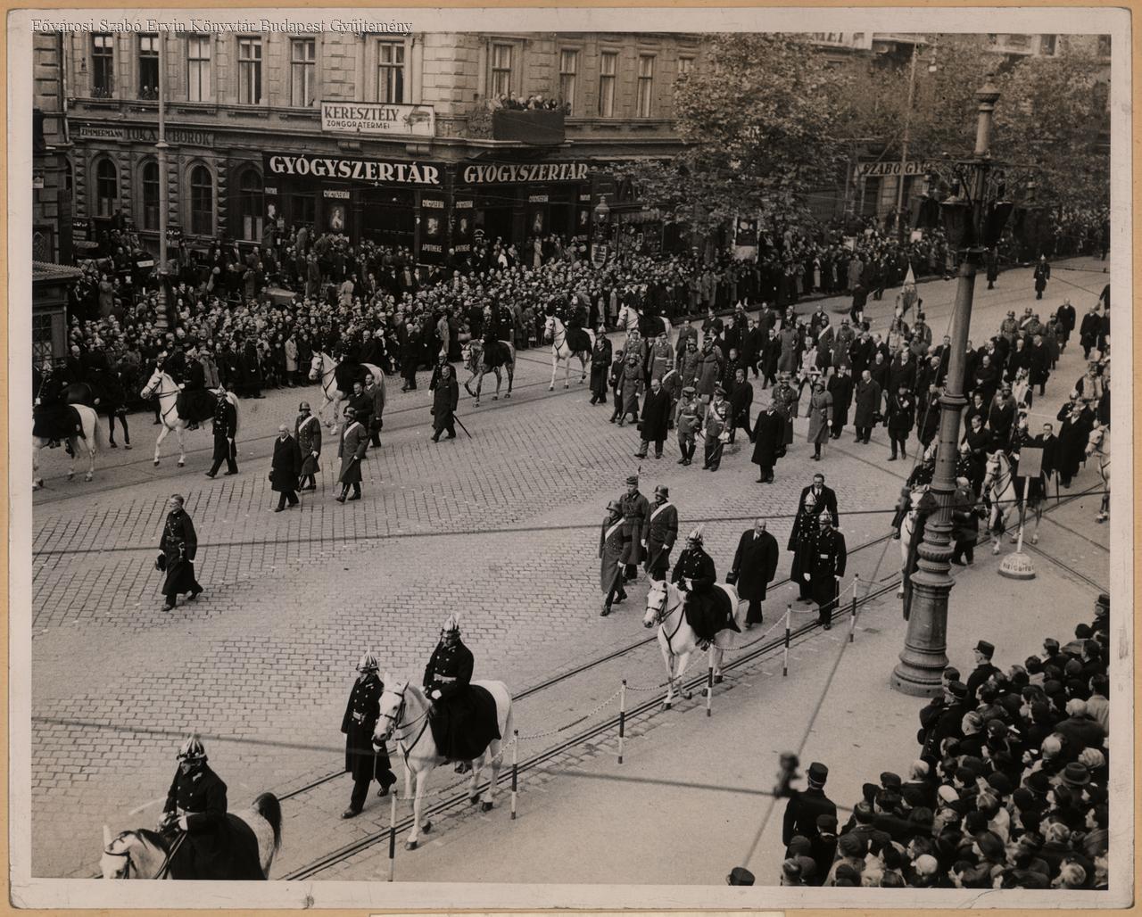 Az akkori Vilmos császár út 66 előtt halad a menet élén Horthy Miklóssal, oldalt lovasrendőrök sorfala, kordon