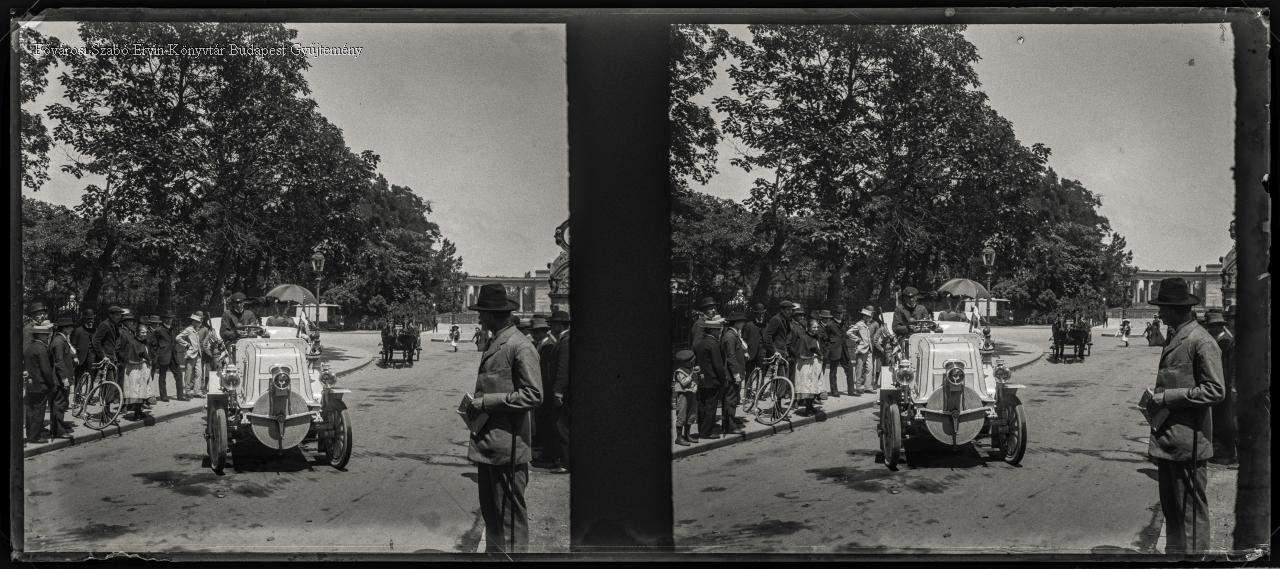 [Andrássy út, automobil és közönsége] [Andrassy Avenue, an automobile and its audience]