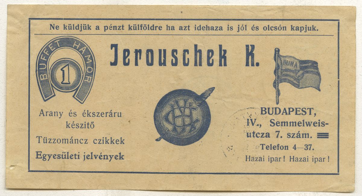 zománcművészet, ötvösség, egyesület, patkó, zászló, üzlet, reklámnyomtatvány, kisnyomtatvány, aprónyomtatvány, számolócédula