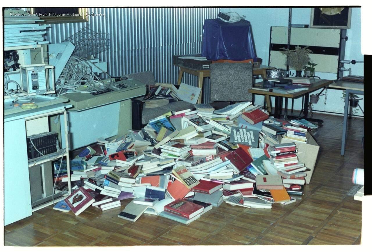 [A Beton- és Vasbetonipari Művek párt-és szakszervezeti könyvtárainak halomba hordott, feltételezhetően selejtezés előtt álló könyvei]