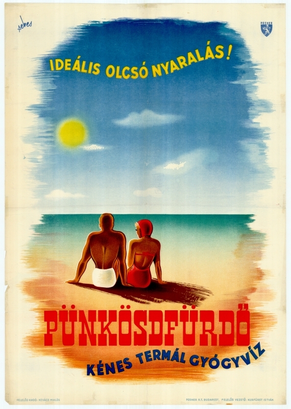 A kénes termál gyógyvízről ismert pünkösdfürdői termálstrand grafikus reklámplakátja, melyen két fürdőruhás személy látható.