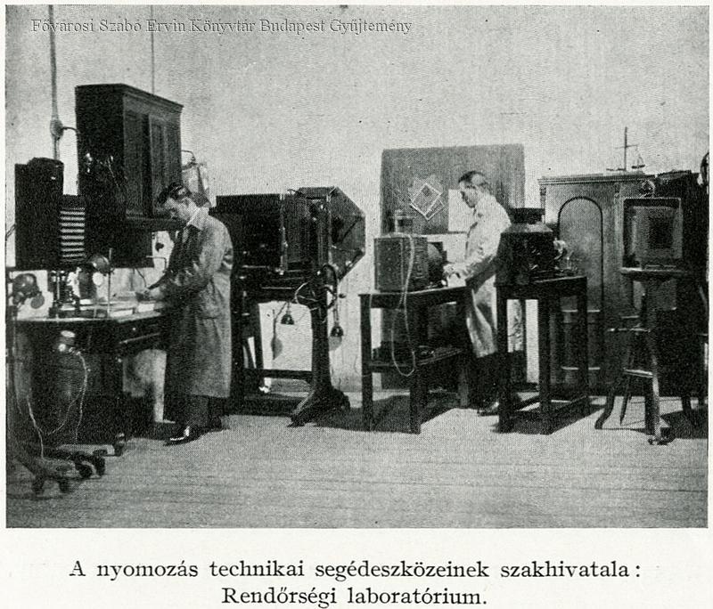 Rendőrségi laboratórium, ujjlenyomat-gyűjt., leírócsop., múzeumbelső