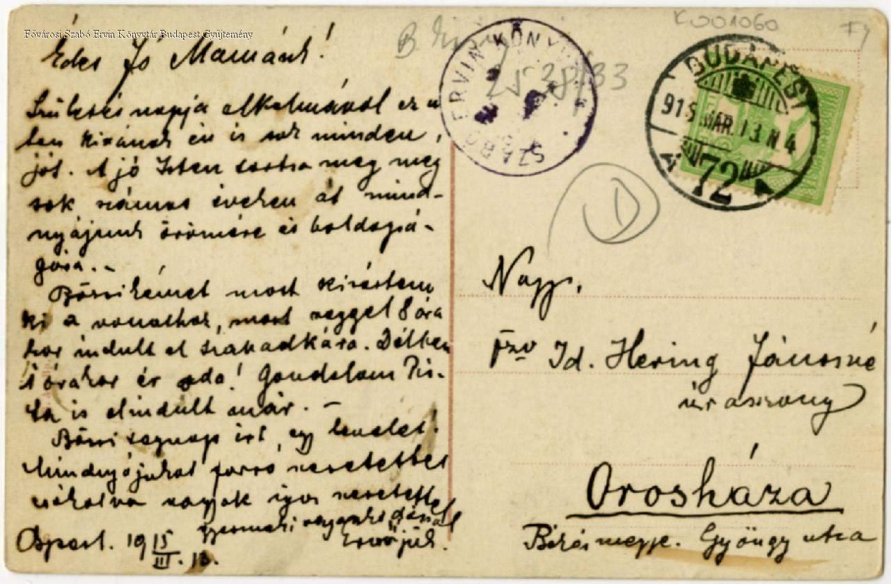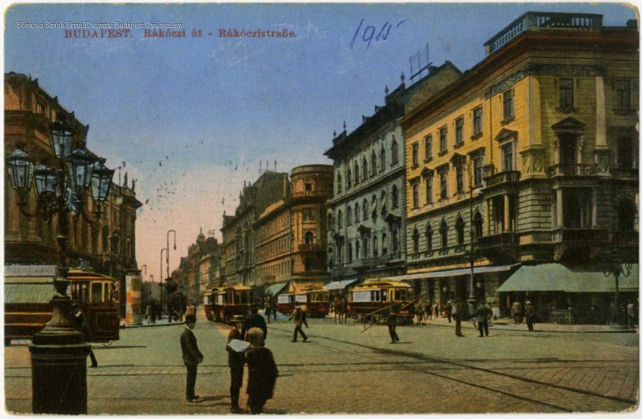 Bal oldalt a Népszínház épületének sarka jobb oldalt első az EMKE épülete, a harmadik ház, az Akácfa utca sarkán a Hotel Orient. Előtérben egy ötágú kandelláber
