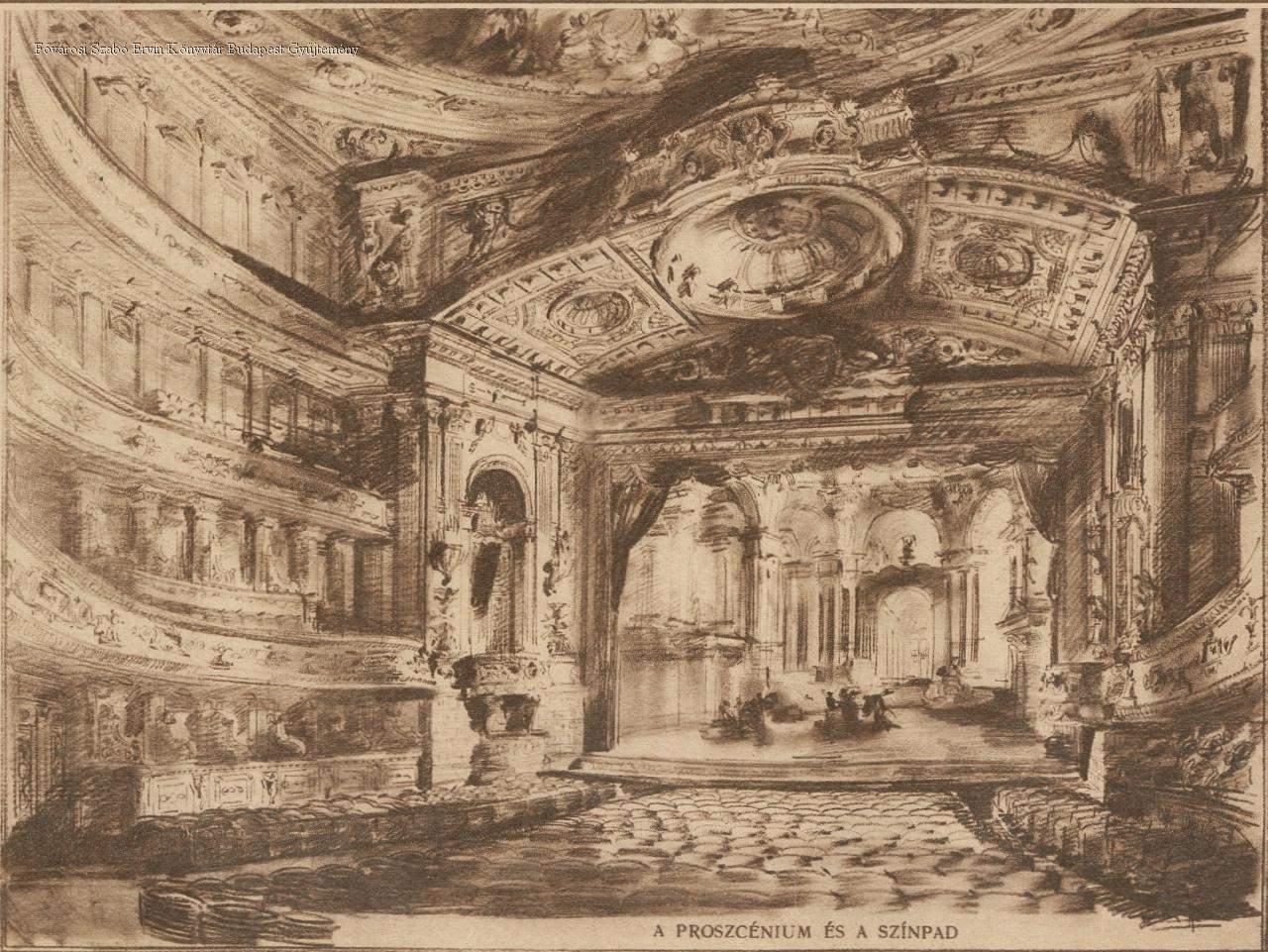 Az új Nemzeti Színház nézőtere Pogány és Tőry műépítészek rajzai : a színpadról nézve : a proszcénium és a színpad