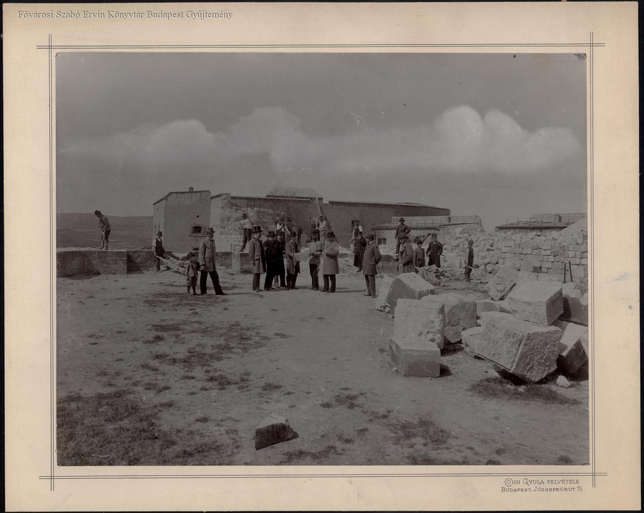 Városi elöljárók csoportja a Citadellán. Kezükben tervrajz. Körülöttük rendőrök és munkások csákánnyal, talicskával. A bontásból származó építőanyag. Háttérben a budai hegyek. A bontás 1899. február 26-án kezdődött meg. A főváros által delegált bizottság 1899 márciusában tart szemlét a területen. Nagyszokolyay Béla közlése