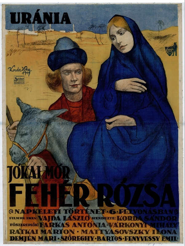 Az Urániában vetített Fehér Rózsa című film plakátja. Felirat a plakáton: Napkeleti történet 6 felvonásban. Filmre írta: Vajda László, Rendezte: Korda Sándor, Főszereplők: Farkas Antónia, Várkonyi Mihály, Rátkai Márton, Mattyasovszky Ilona, Demjén Mari, Szőreghy, Bartos, Fenyvessy Emil