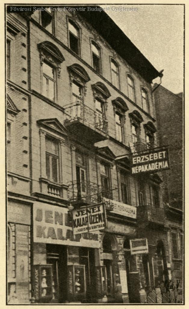 Országos Magyar Zenész Szövetség, Budapest VII. Rákóczi út 30 a kép felett a szövegben. Lakóház, Erzsébet Népakadémia felirat