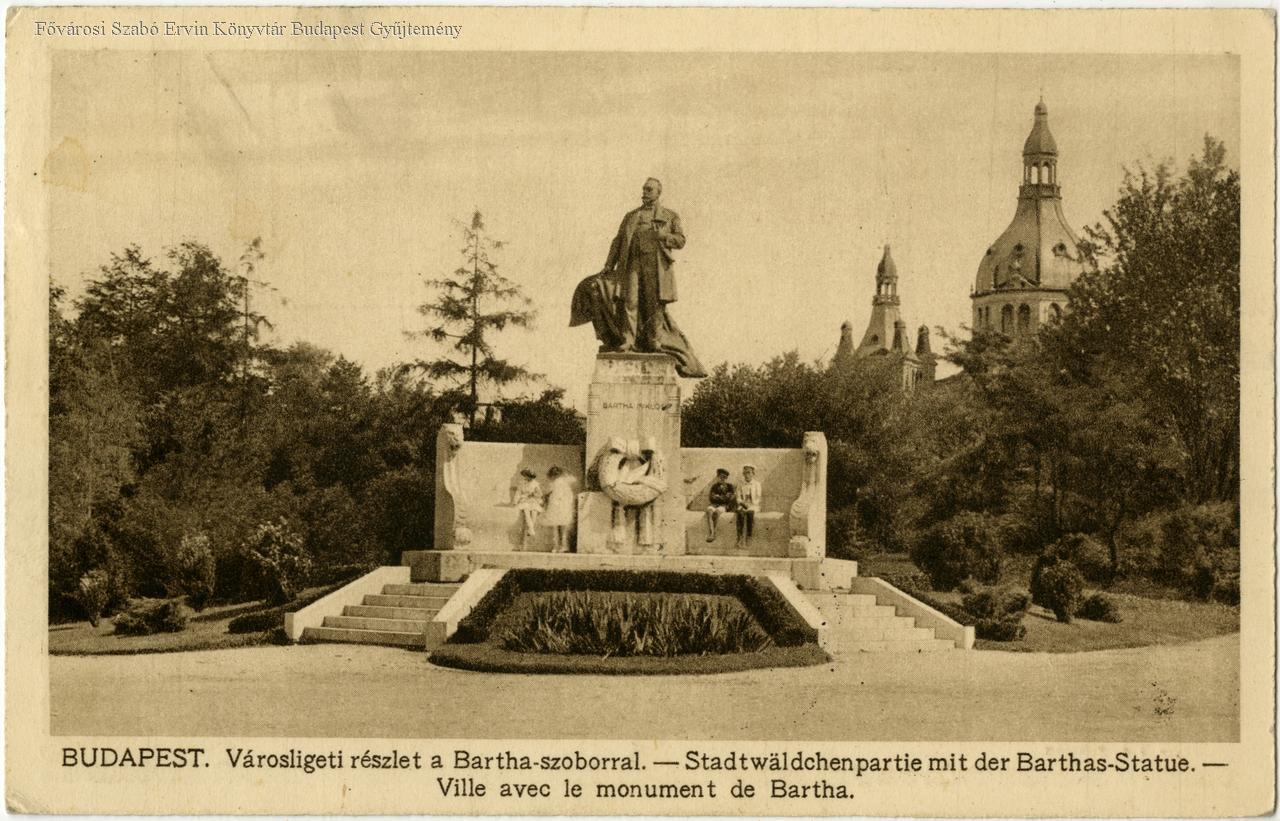 Budapest Városligeti parkrészlet a Bartha-szoborral = Stadtwäldchenpartie mit der Bartha-Statue = Ville avec le monument de Bartha