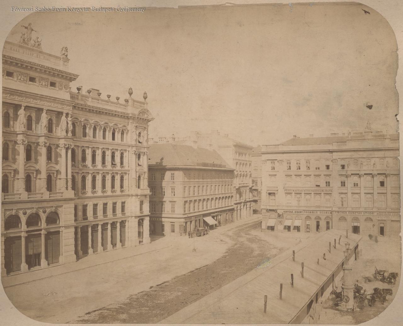 bérház, áruház, szálloda, fiáker, bank, kávéház, kút, lámpa, utcakép, 1874 körül