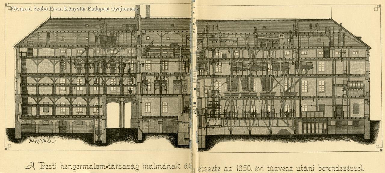 A Pesti Hengermalom-Társaság malmának átmetszete az 1850. évi tűzvész utáni berendezéssel