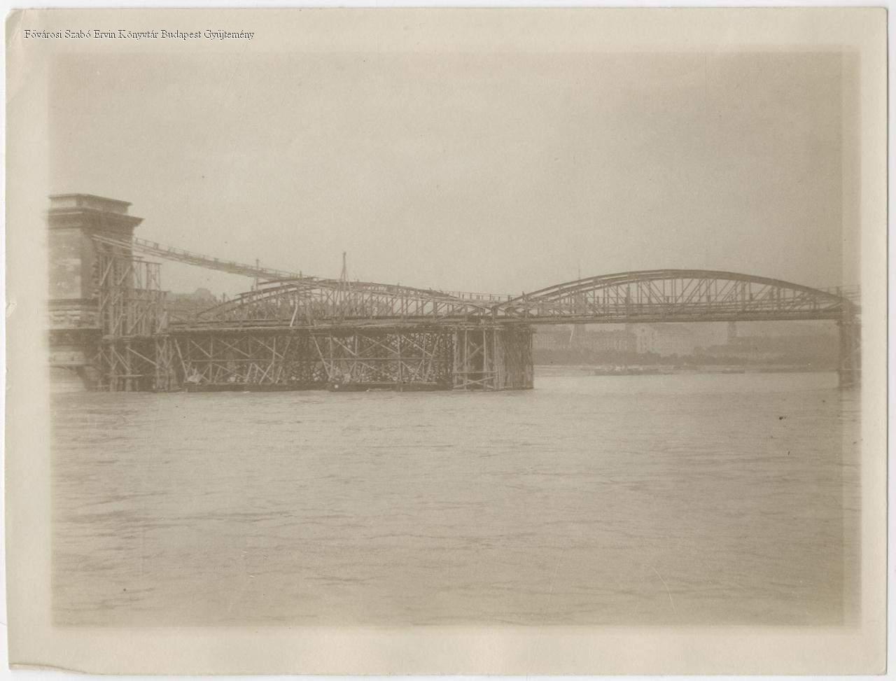 A Lánchíd átépítése, vasszerkezetének megerősítése. Teljes rekonstrukció: 1914. február 3-tól 1915. november 26-ig. Látkép a Duna felől.