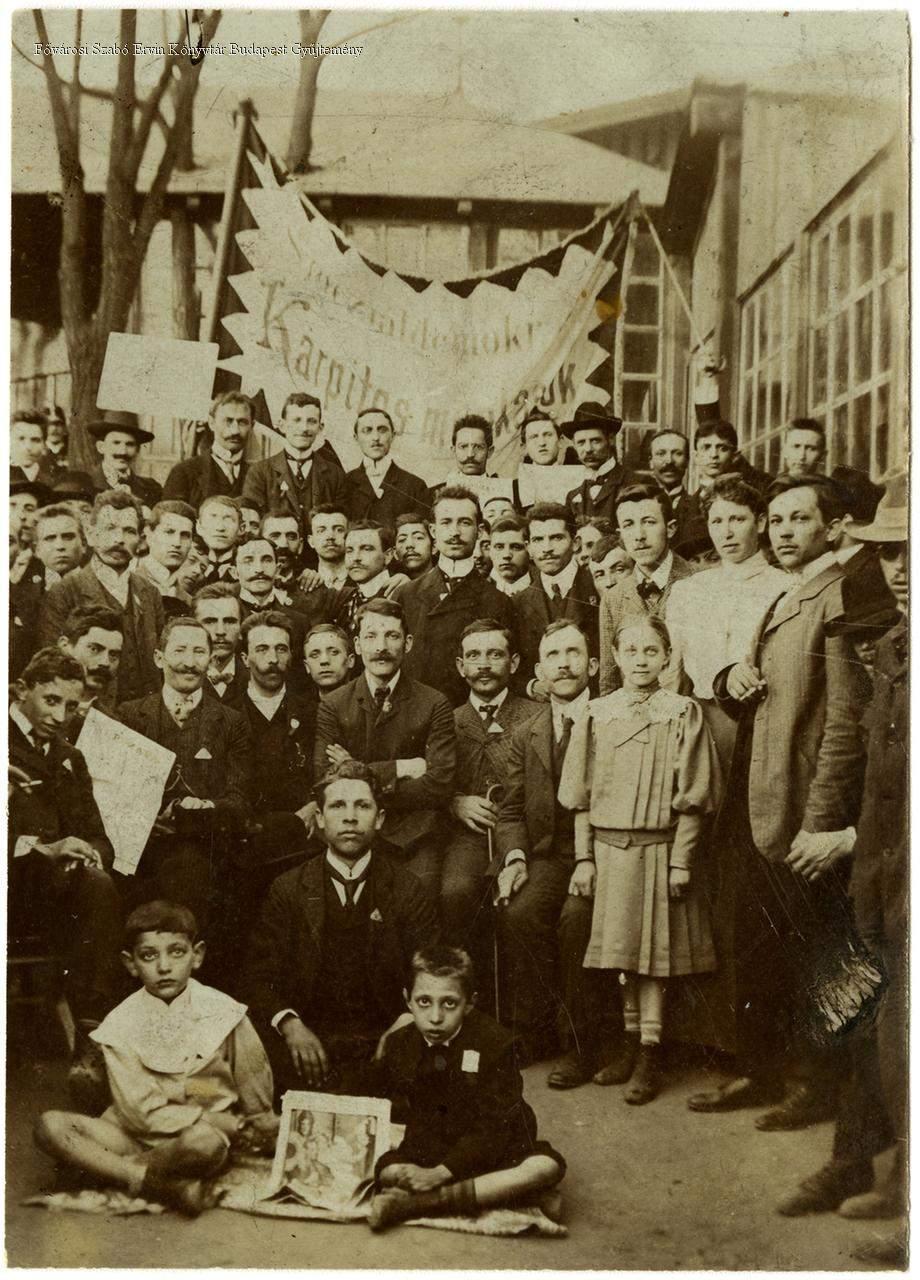 munkásmozgalom, munkás, kárpitos, férfi, nő, gyermek, zászló, csoportkép, 1910-es évek