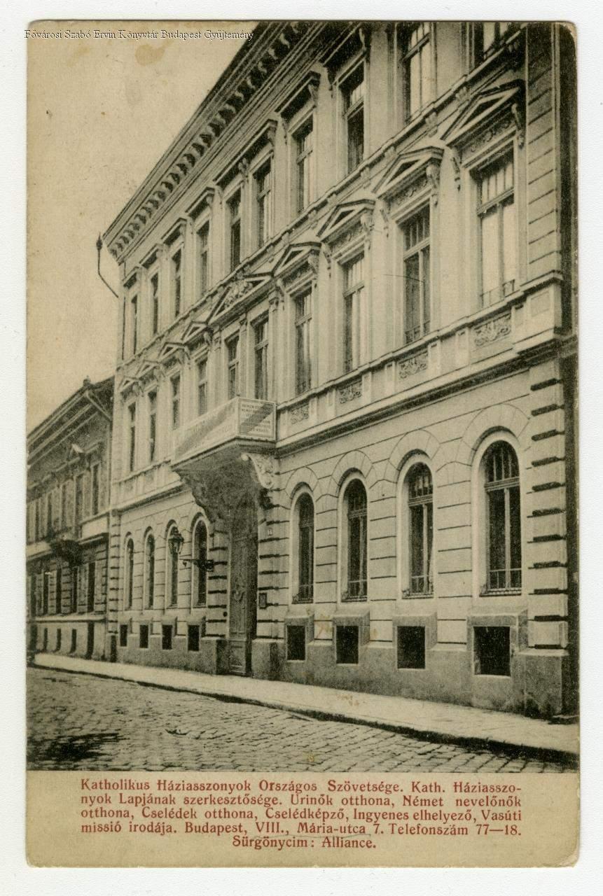 Katholikus Háziasszonyok Országos Szövetsége Kath. Háziasszonyok Lapjának szerkesztősége : Urinők otthona, Német nevelőnők otthona, Cselédek otthona, Cselédképző, Ingyenes elhelyező, Vasúti missió irodája : Budapest, VIII., Mária-u. 7.
