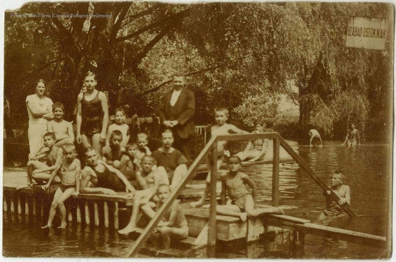 strandfürdő, fürdőruha, fürdőzés, fa, család, ember, művész, külső felvétel, csoportkép, 1910-es évek