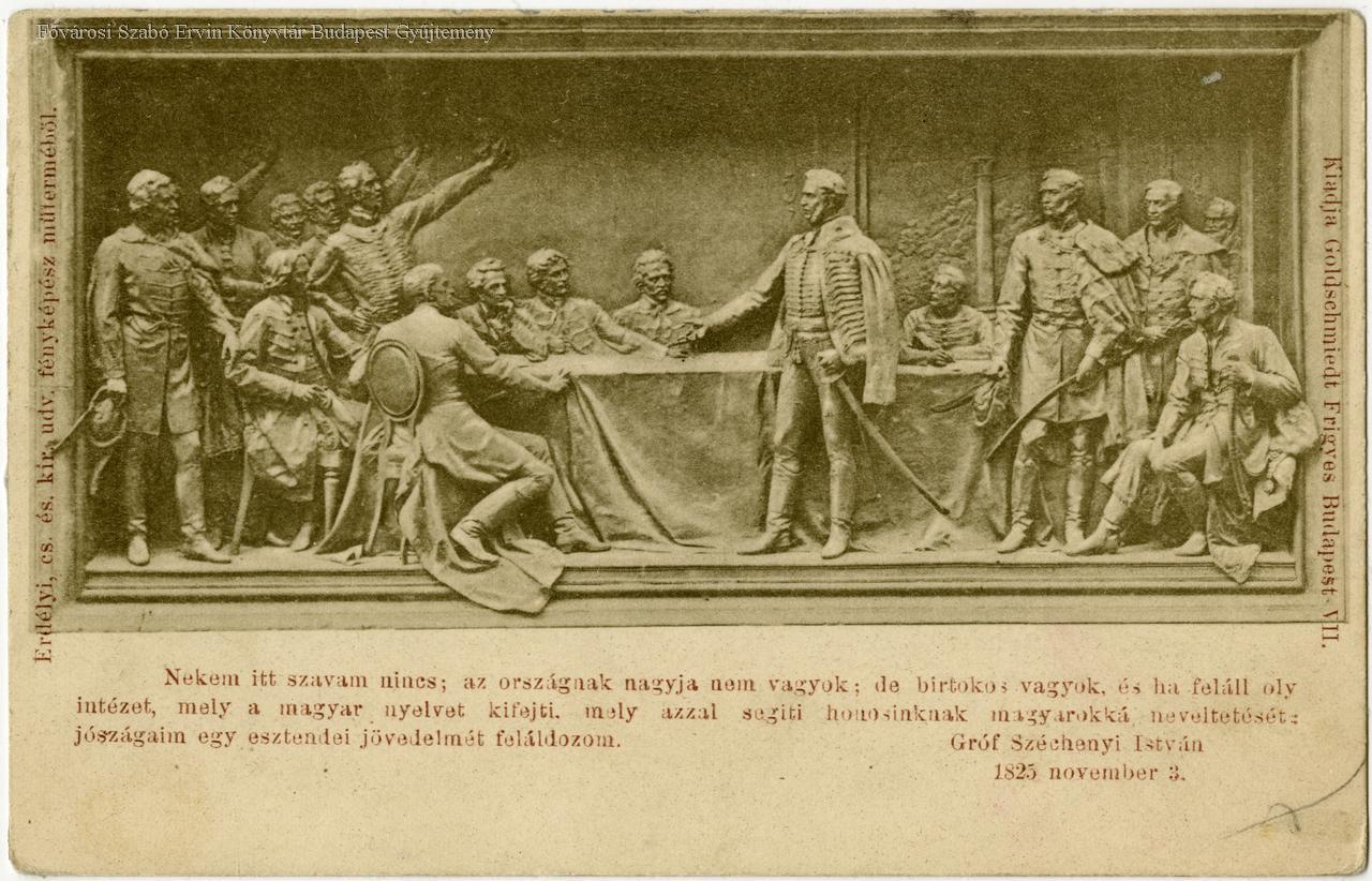 Idézet a képeslapon: "Nekem itt szavam nincs; az országnak nagyja nem vagyok; de birtokos vagyok, és ha feláll oly intézet, mely a magyar nyelvet kifejti, mely azzal segiti honosinknak magyarokká neveltetését: jószágaim egy esztendei jövedelmét feláldozom." Gróf Széchenyi István 1825 november 2.