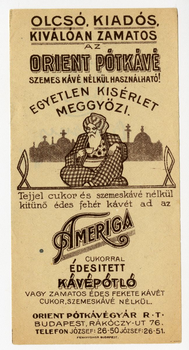 kávé, pótkávé, ital, cikória, kávépótló, tej, cukor, törökök, kávézás, mecset, Kelet, reklámnyomtatvány, kisnyomtatvány, aprónyomtatvány, számolócédula