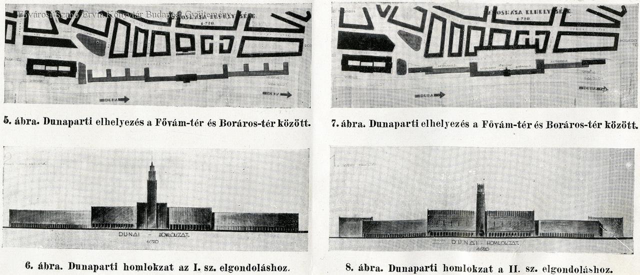 Helyszínrajzok és Duna-parti homlokzatok. Két változat a mai Dimitrov tér és Boráros tér között építendő Városházára