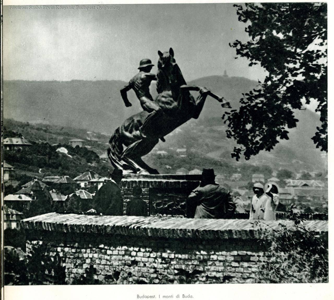 Budapest. I monti di Buda [Az erdélyi huszárezred emlékművének közelképe, háttérben hegyek]