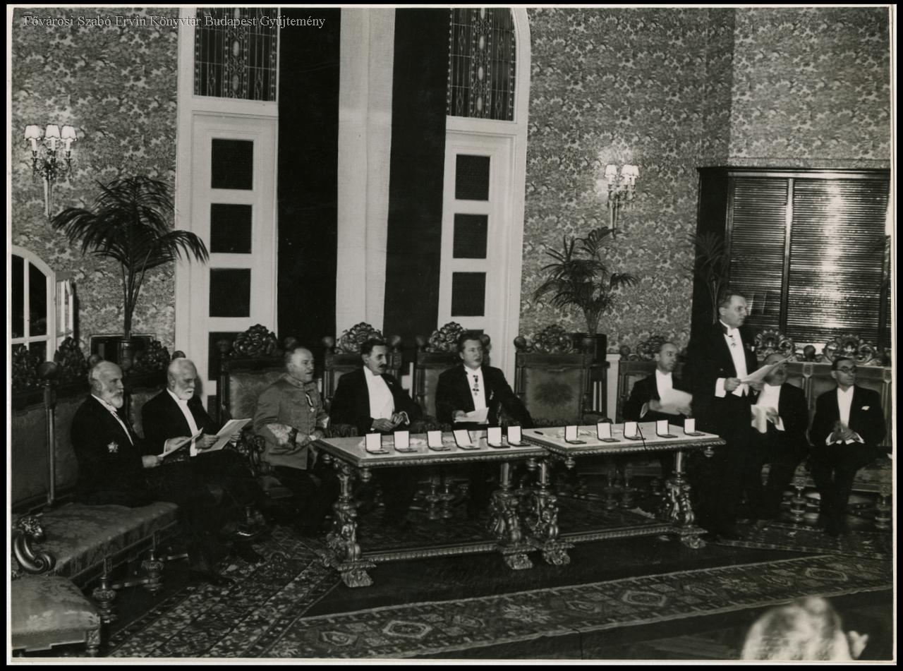Díszes mintázatú teremben 9 személy az elnöki asztalnál. Az asztalon kitüntetések. Balszélen Szablya János, jobbszélen Pacher (Péczely) Béla