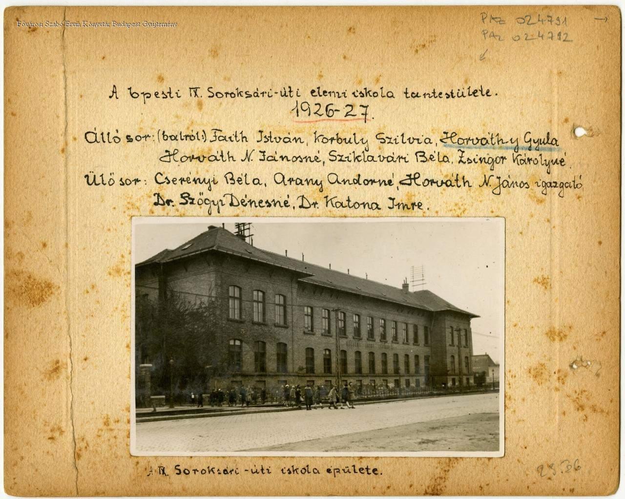 Az iskola épülete, előtte az úton átkelő diákok csoportja. A kép körül a kartonon az elemi iskola 1926-1927-es tantestületének névsora (csoportképük a másik oldalon, adatbázisunkban 024791 sz. kép) )