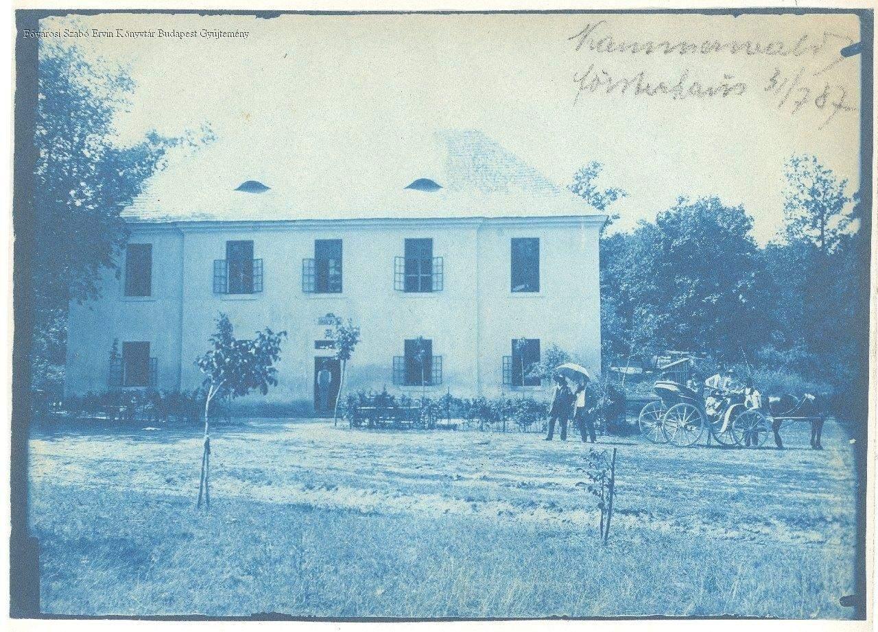 lakóépület, épületkép, lovas kocsi, növényzet, facsemete, ember, napernyő
