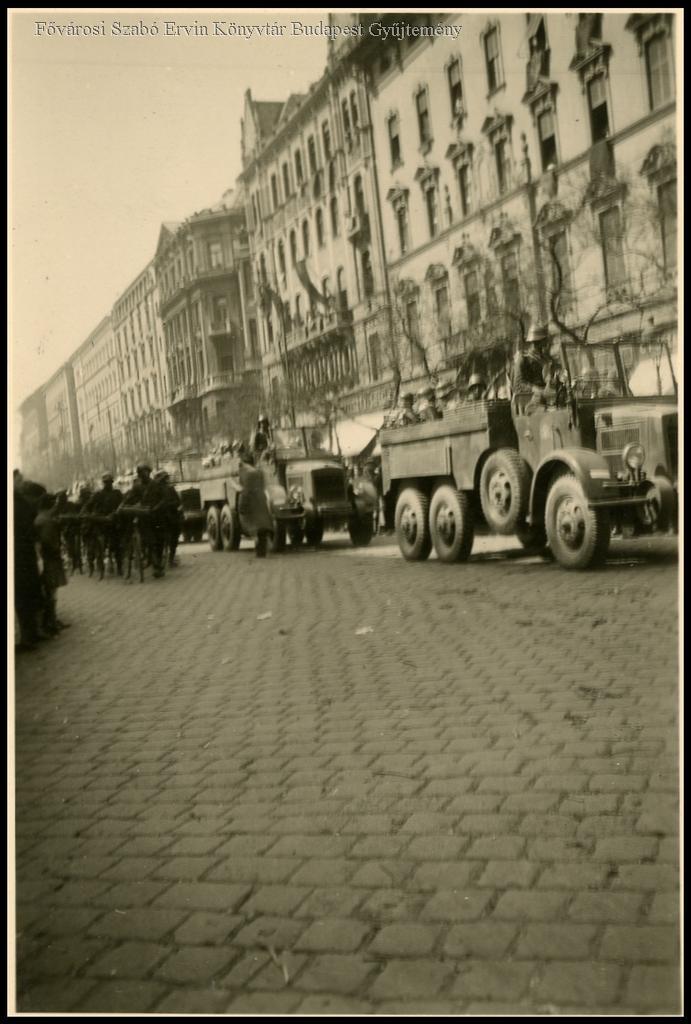 [Katonák harci járműveken és kerékpárokkal menetelve a Nagykörúton indulóban a frontra a gyorshadtest