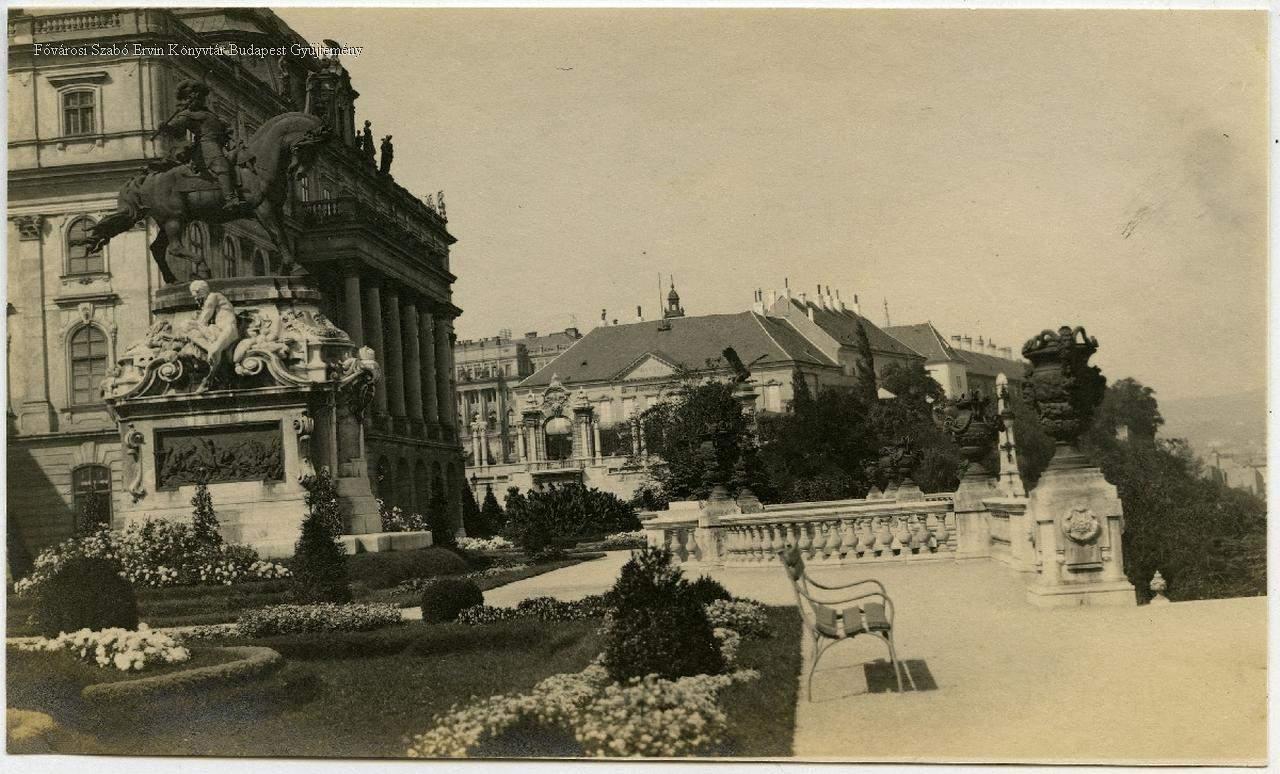 [Várkert (a mai Savoyai-terasz) részlete, balra Savoyai Jenő lovasszobra]