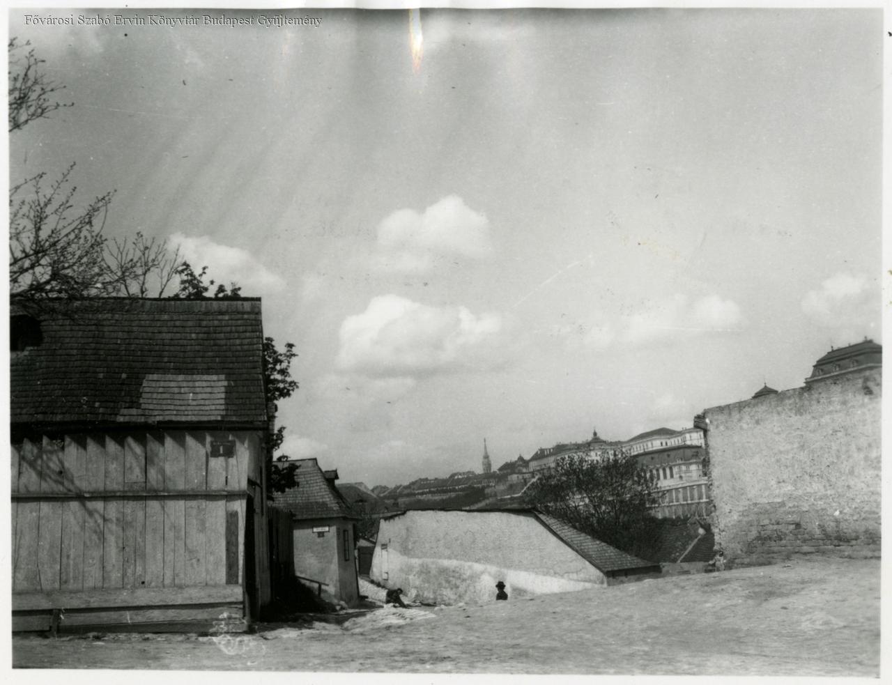[Tabán, Harkály utca, háttérben a budai vár épületei, 1902. május 5-én]