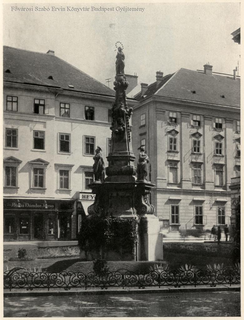 A régi Mária-emlék. Az 1729-ben állított barokk Mária-oszlop Andreas Rieder alkotása. 1941-ben Erdei Dezső szobrát állították fel a helyén a Szervita téren