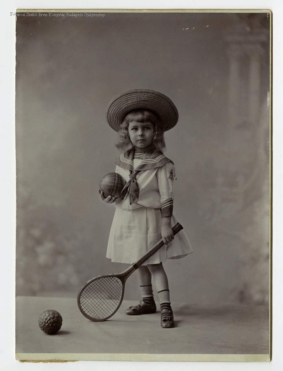 műtermi portré, teljes alakú kép, gyermek, lánygyermek, játékszer, tenisz, labda, századforduló